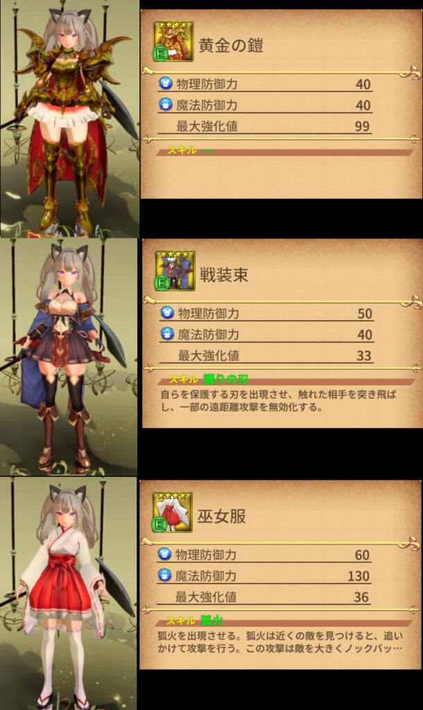 | 巫女服 物理防御 60 魔法防御 130 スキル 狐火 |