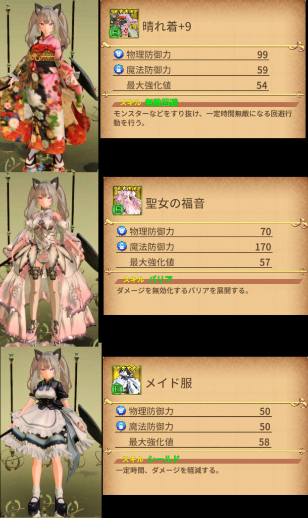 晴れ着 物理防御 90 魔法防御 50 スキル 無敵回避 |