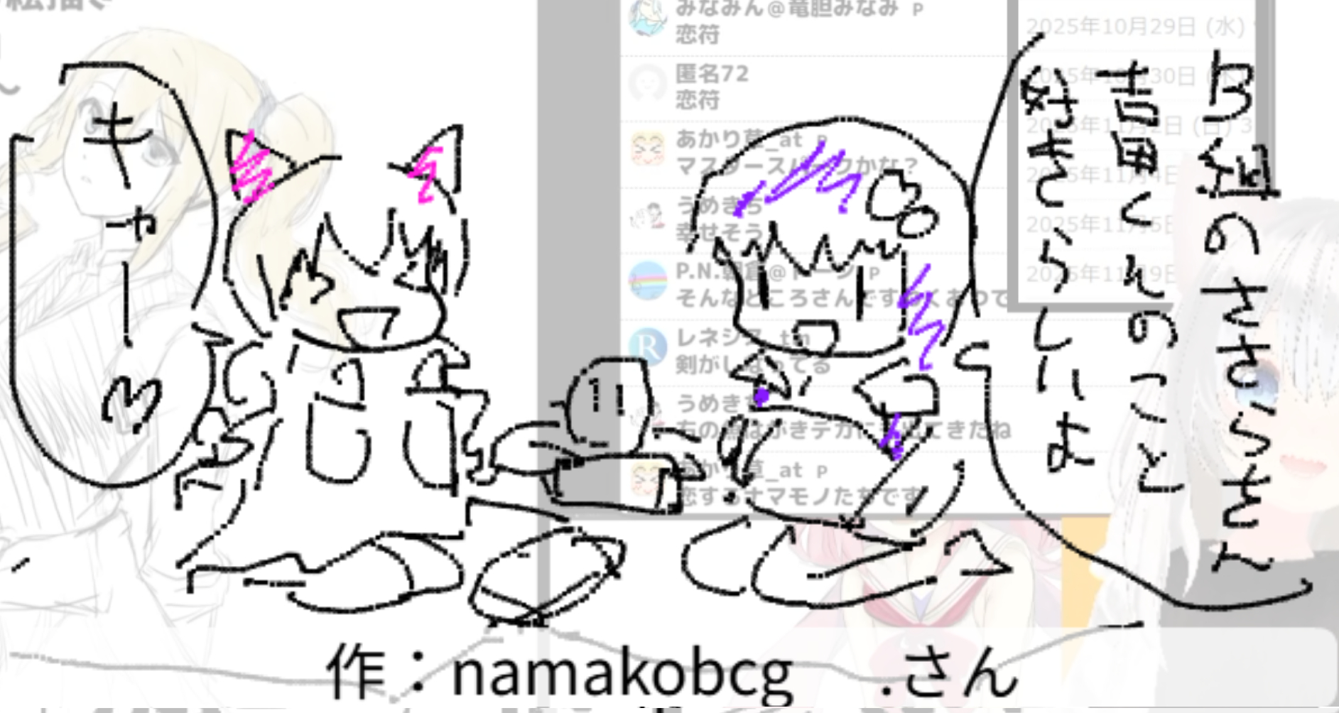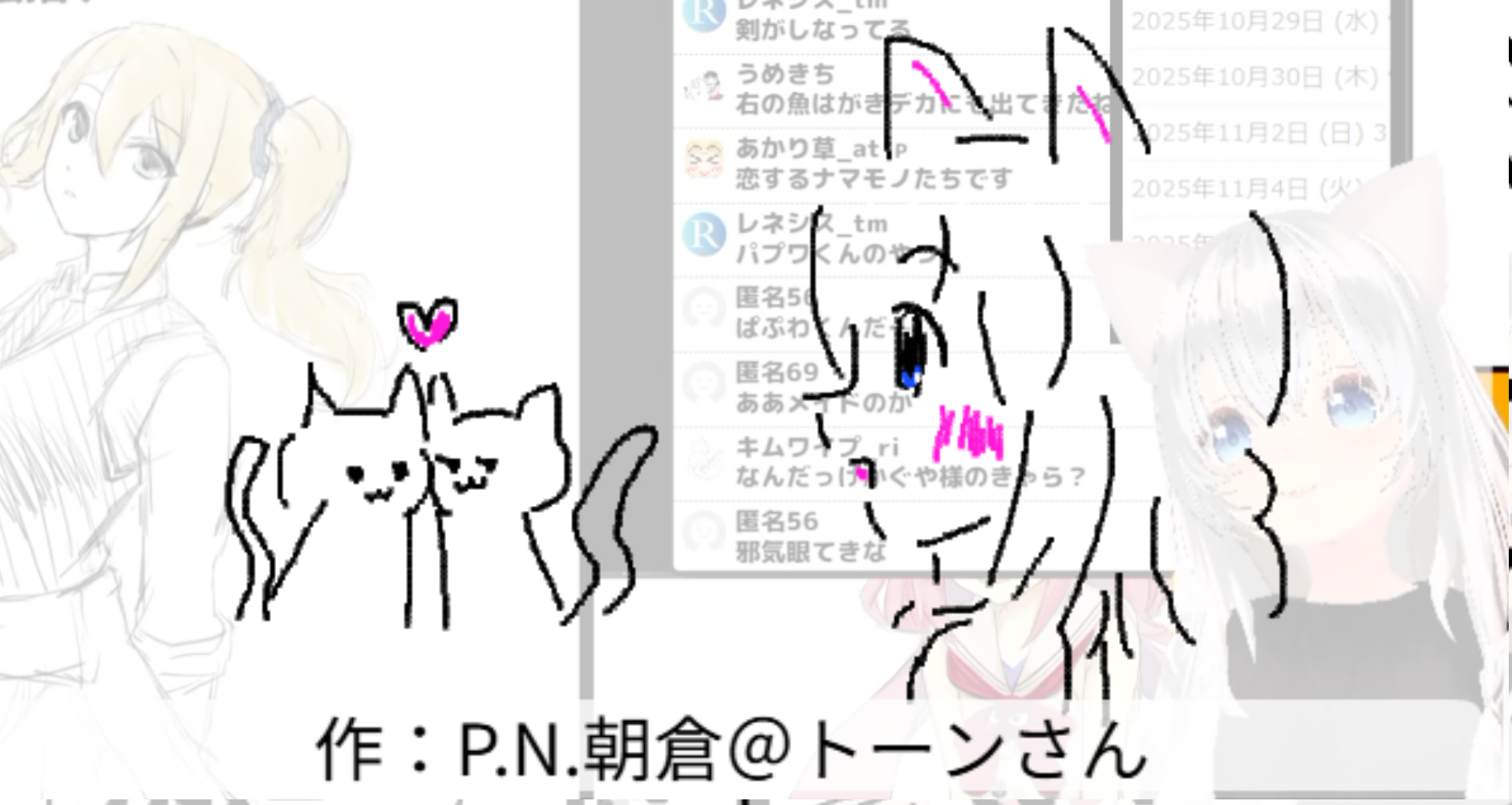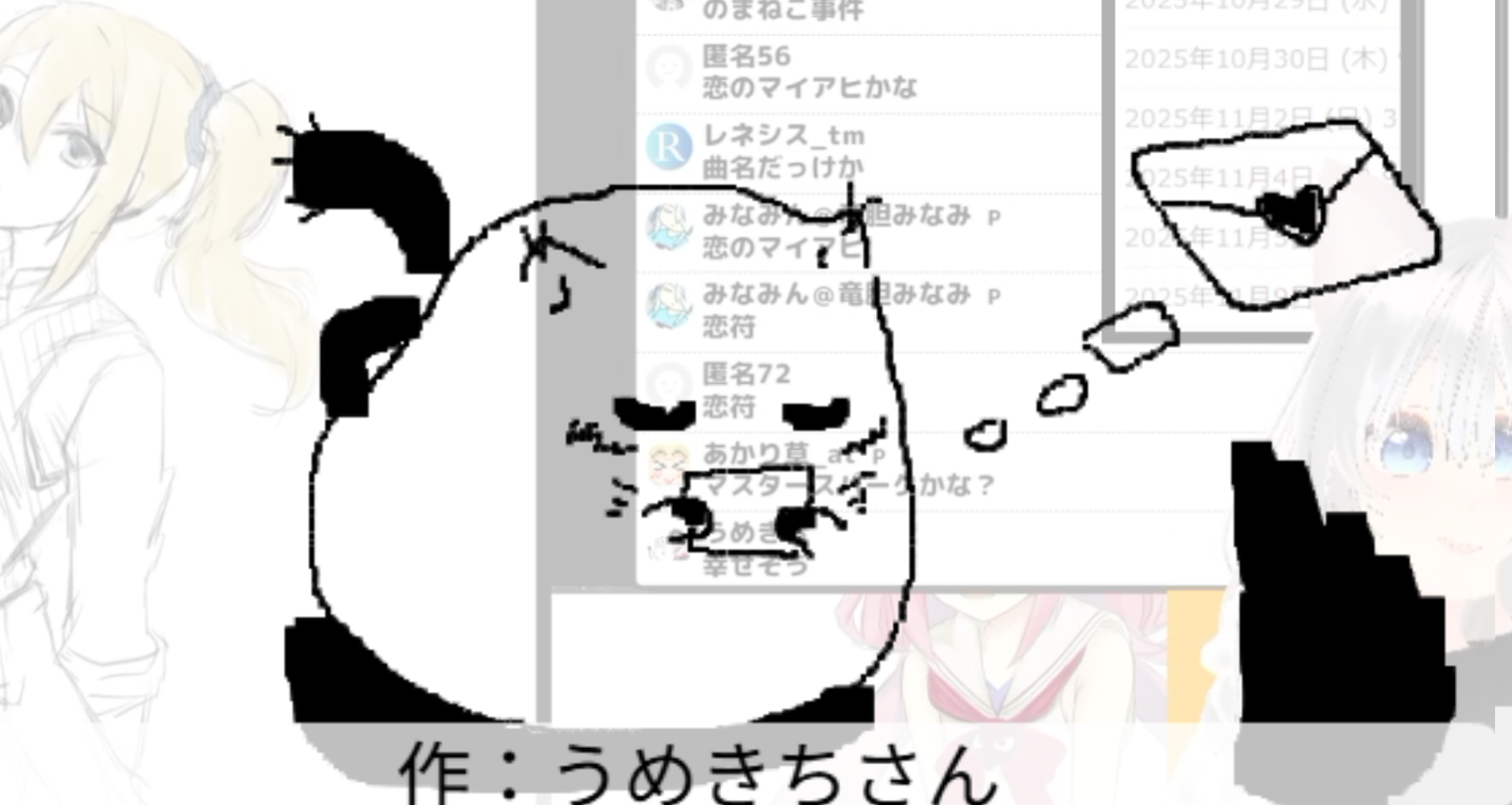 2025/10/29「恋」 2025.10.29 ホーム › フォーラム › お題でお絵かき保存場所 › 2025/10/29「恋」 このトピックには9件の返信、1人の参加者があり、最後に竹ちくわにより1週、 1日前に更新されました。 9件の返信スレッドを表示中 投稿者 投稿 2025年10月29日 (水) 11:32 PM #2970 返信 竹ちくわキーマスター 明日が初恋の日らしいので 2025年10月29日 (水) 11:33 PM #2971 返信 竹ちくわキーマスター かぐや様は告らせたい〜天才たちの恋愛頭脳戦〜より早坂愛 Attachments:251029.jpg 2025年10月29日 (水) 11:36 PM #2973 返信 竹ちくわキーマスター 南国少年パプワくんより恋するナマモノ 作:DUKeさん この返信は1週、 1日前に竹ちくわが編集しました。 Attachments:251029_01.jpg 2025年10月29日 (水) 11:38 PM #2976 返信 竹ちくわキーマスター 鬼滅の刃 甘露寺蜜璃 作:piさん Attachments:251029_02.jpg 2025年10月29日 (水) 11:38 PM #2978 返信 竹ちくわキーマスター 作:P.N.朝倉@トーンさん Attachments:251029_03.jpg 2025年10月29日 (水) 11:40 PM #2980 返信 竹ちくわキーマスター 「恋符・マスタースパーク」 作:みなみんさん Attachments:251029_04.jpg 2025年10月29日 (水) 11:40 PM #2982 返信 竹ちくわキーマスター 恋バナ 作:namakobcgさん Attachments:251029_05.jpg 2025年10月29日 (水) 11:41 PM #2984 返信 竹ちくわキーマスター 恋のマイアヒ 作:ゲストさん Attachments:251029_06.jpg 2025年10月29日 (水) 11:42 PM #2986 返信 竹ちくわキーマスター 白い恋人 作:レネシスさん Attachments:251029_07.jpg 2025年10月29日 (水) 11:42 PM #2988 返信 竹ちくわキーマスター ラブレター 作:うめきちさん Attachments:251029_08.jpg 投稿者 投稿 9件の返信スレッドを表示中 返信先: 2025/10/29「恋」 あなたの情報: お名前 (必須) メール (非公開): ウェブサイト: 以下の HTML タグと属性を使用できます。 <a href="" title="" rel="" target=""> <blockquote cite=""> <code> <pre class=""> <em> <strong> <del datetime="" cite=""> <ins datetime="" cite=""> <ul> <ol start=""> <li> <img src="" border="" alt="" height="" width=""> Upload Attachments Maximum file size allowed is 2 MB. Attachments: Add another file キャンセル 送信