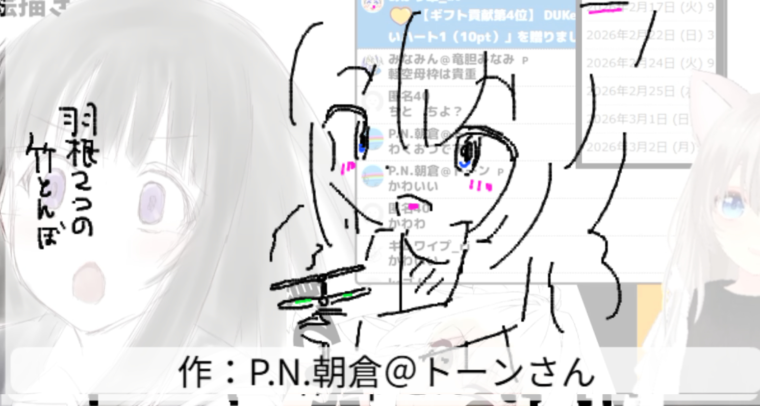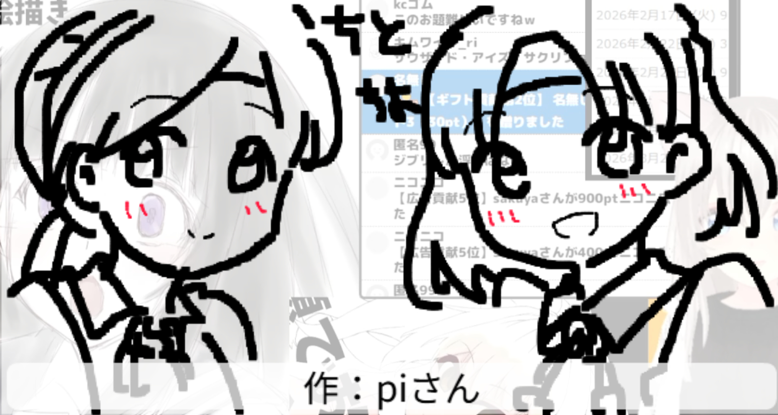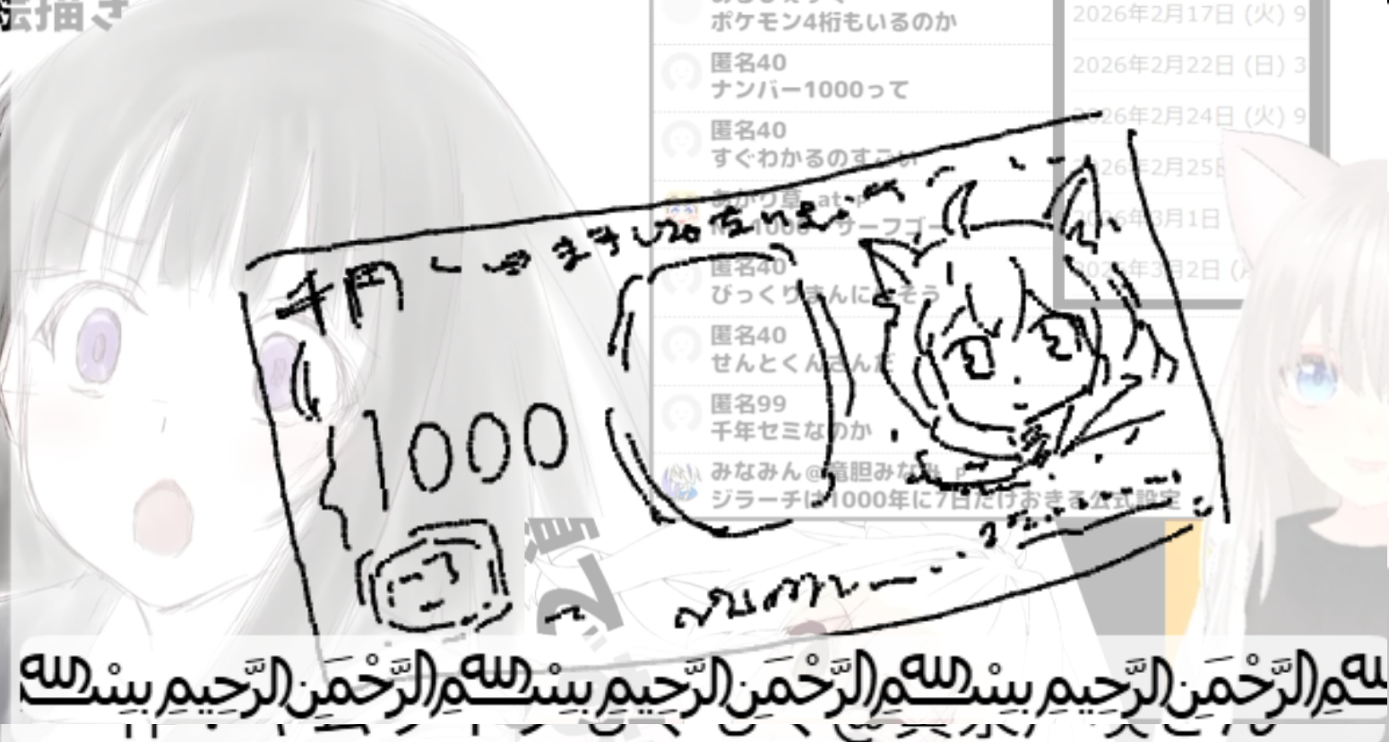 2026/02/17「千」 2026.02.17 ホーム › フォーラム › お題でお絵かき保存場所 › 2026/02/17「千」 このトピックには7件の返信、1人の参加者があり、最後に竹ちくわにより1週、 3日前に更新されました。 7件の返信スレッドを表示中 投稿者 投稿 2026年2月17日 (火) 11:03 PM #3920 返信 竹ちくわキーマスター 千切り大根(切り干し大根)の日らしいので 2026年2月17日 (火) 11:04 PM #3921 返信 竹ちくわキーマスター 氷菓より千反田える Attachments:260217.jpg 2026年2月17日 (火) 11:36 PM #3923 返信 竹ちくわキーマスター 艦これより千歳・千代田 作:piさん Attachments:260217_01.jpg 2026年2月17日 (火) 11:37 PM #3925 返信 竹ちくわキーマスター 竹トンボの形が千 作:P.N.朝倉@トーンさん Attachments:260217_02.jpg 2026年2月17日 (火) 11:39 PM #3927 返信 竹ちくわキーマスター ジラーチは、1000年に一度だけ目を覚ますと言われる「ねがいごとポケモン」 作:みなみんさん Attachments:260217_03.jpg 2026年2月17日 (火) 11:39 PM #3929 返信 竹ちくわキーマスター せんとくん 作:DUKeさん Attachments:260217_04.jpg 2026年2月17日 (火) 11:40 PM #3931 返信 竹ちくわキーマスター ポケモンSVよりNo.1000 サーフゴー 作:キムワイプさん Attachments:260217_05.jpg 2026年2月17日 (火) 11:41 PM #3933 返信 竹ちくわキーマスター 千円札 作:KCゴムさん Attachments:260217_06.jpg 投稿者 投稿 7件の返信スレッドを表示中 返信先: 2026/02/17「千」 あなたの情報: お名前 (必須) メール (非公開): ウェブサイト: 以下の HTML タグと属性を使用できます。 <a href="" title="" rel="" target=""> <blockquote cite=""> <code> <pre class=""> <em> <strong> <del datetime="" cite=""> <ins datetime="" cite=""> <ul> <ol start=""> <li> <img src="" border="" alt="" height="" width=""> Upload Attachments Maximum file size allowed is 4 MB. Attachments: Add another file キャンセル 送信